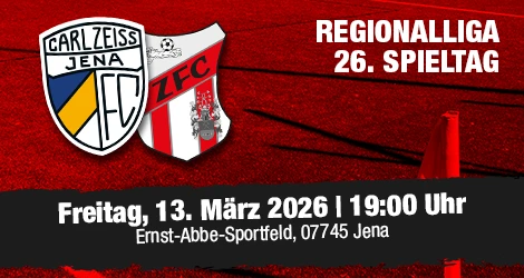 (11.03.26 08:00 Uhr) Im Rahmen des 26. Spieltages der Regionalliga Nordost muss unser ZFC am Freitag, dem 13.03.2026, zum „kleinen“ Thüringer Derby nach Jena, um sich mit dem dort beheimateten FC Carl Zeiss zu duellieren.