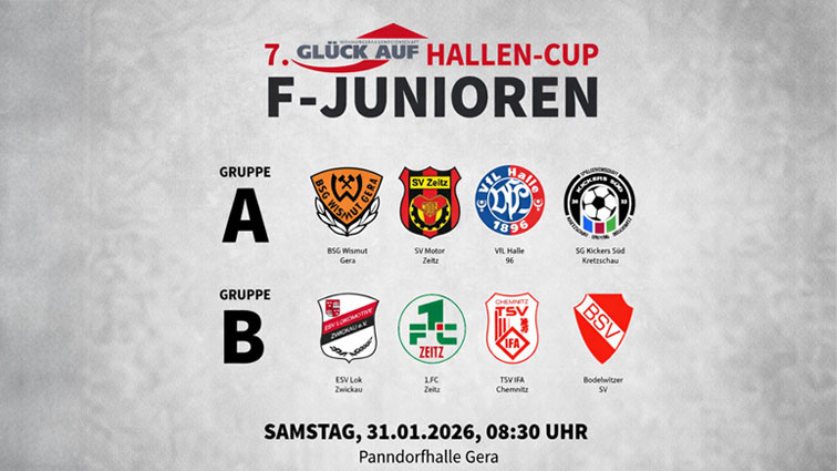 (20.01.26 13:47 Uhr) Am 31.01. und 01.02.2026 findet der 7. Hallen-Cup der BSG Wismut Gera in der Panndorfhalle statt. Den Auftakt machen am Samstagvormittag ab 8:30 Uhr die F-Junioren. Acht Teams kämpfen in zwei Gruppen um Pokale und Medaillen. Sponsor ist erneut die WBG „Glück Auf" Gera eG.